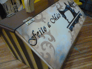 Essa caixa de vinho eu amei fazer, sabe quando vc senta e idealiza o projeto? Foi assim, nada de correria e tempo para criar e incrementar. Nessa caixa usei, pasta de modelagem com estêncil de folhas de parreira com pasta dourada, carimbo de cacho de uva onde eu aquarelei e usei em seguida dimensional e ahhhhhh esqueci, usei a técnica da vela por baixo, onde vc pinta a caixa de marrom escuro, passa em algumas partes vela e depois pintei de verde country com um pouquinho de branco e depois de ter passado umas três mãos lixei onde havia vela e ficou esse desgastado.